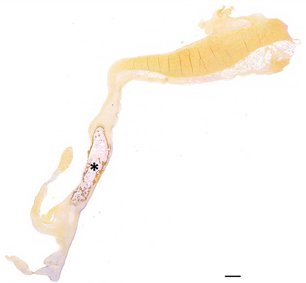 The native leaflet is composed of fibrous and elastic connective tissue that is particularly active during the cardiac cycle. When chronically traumatized (here, from persistent rubbing of an implanted bioprosthetic device), the leaflet may react in various ways. This may include the formation of bone within connective tissue, also called osseous metaplasia, as shown (*). This pathological change would diminish the active role of the leaflet during the cardiac cycle by decreasing its mobility and elasticity, which could impair the function of the implanted bioprosthesis.